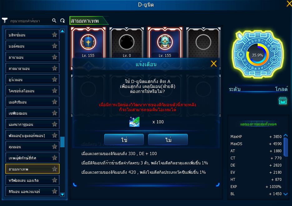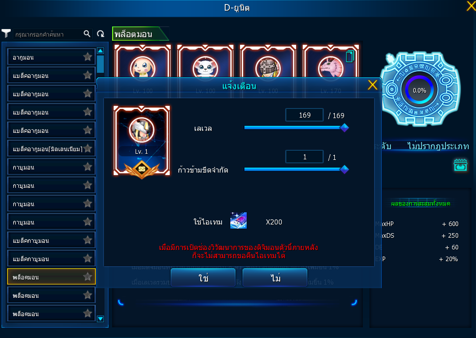 – เมื่อคลิกที่สล็อตวิวัฒนาการของร่างที่ถูกปลดด้วยการแฮกกิ้ง จะแสดงเป็นหน้าต่างที่สามารถเปลี่ยนแปลงข้อมูลเลเวลและการก้าวข้ามขีดจำกัดได้